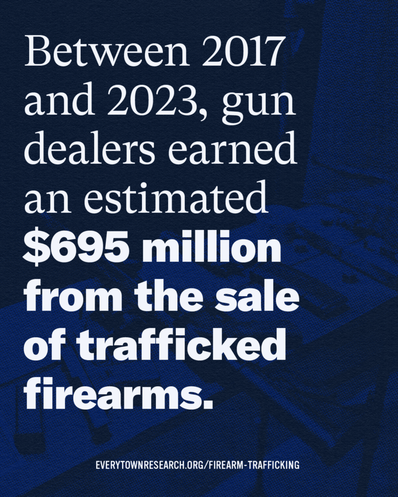 Hundreds of thousands of guns are illegally trafficked into communities, where they are used in shootings and other violent crimes that terrorize neighborhoods. It’s not just individual traffickers who are the problem. Irresponsible gun dealers who fail to secure their supply chains or pay attention to signs of trafficking are also responsible for this crisis. The gun industry is a key actor in the illegal movement of guns and it profits substantially from it. Between 2017 and 2023, gun dealers raked in an estimated $695 million from the sale of trafficked firearms.