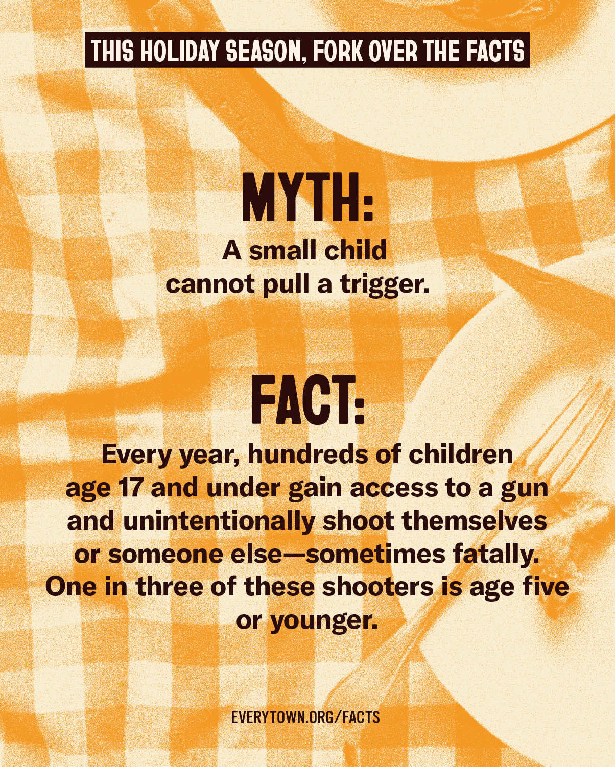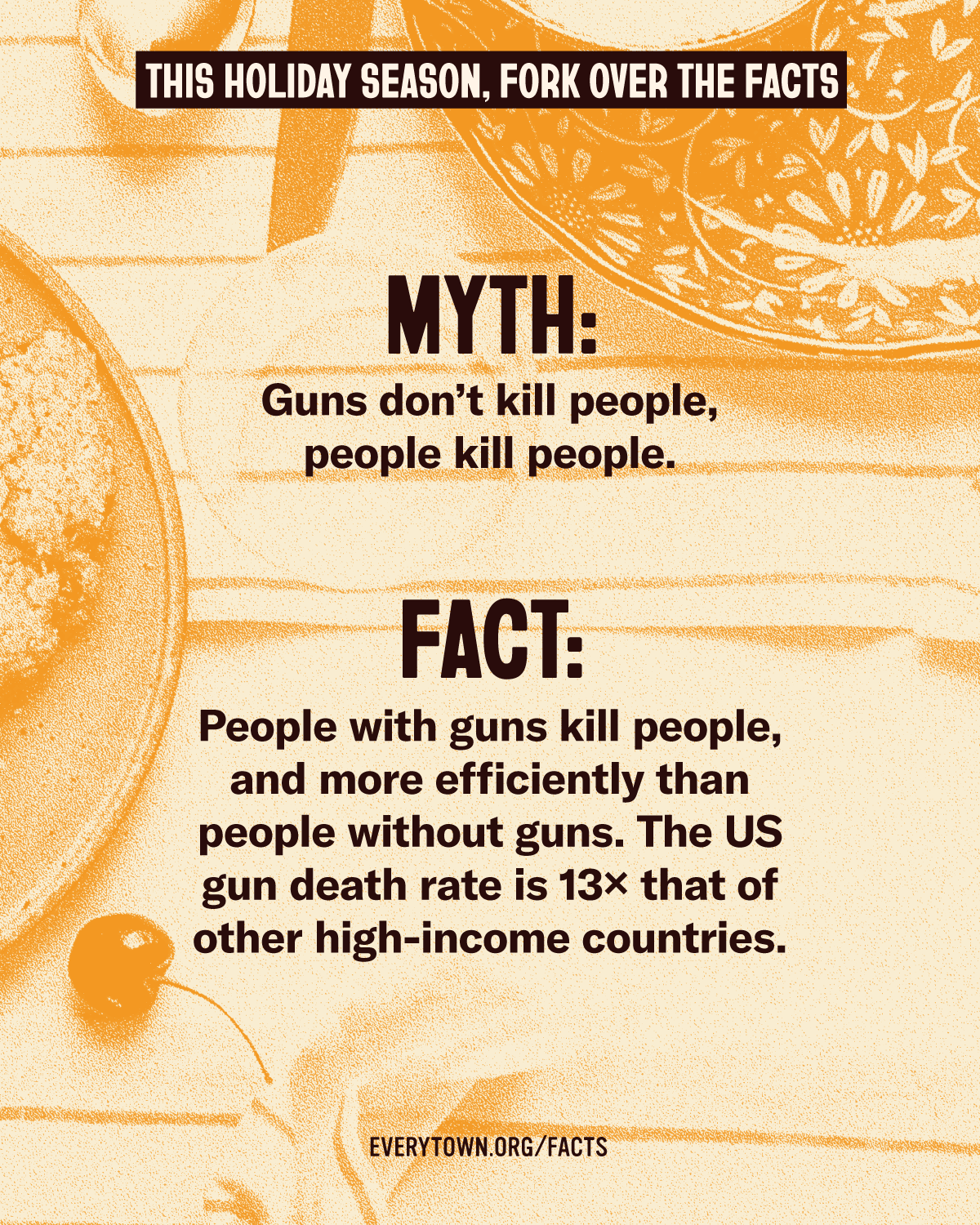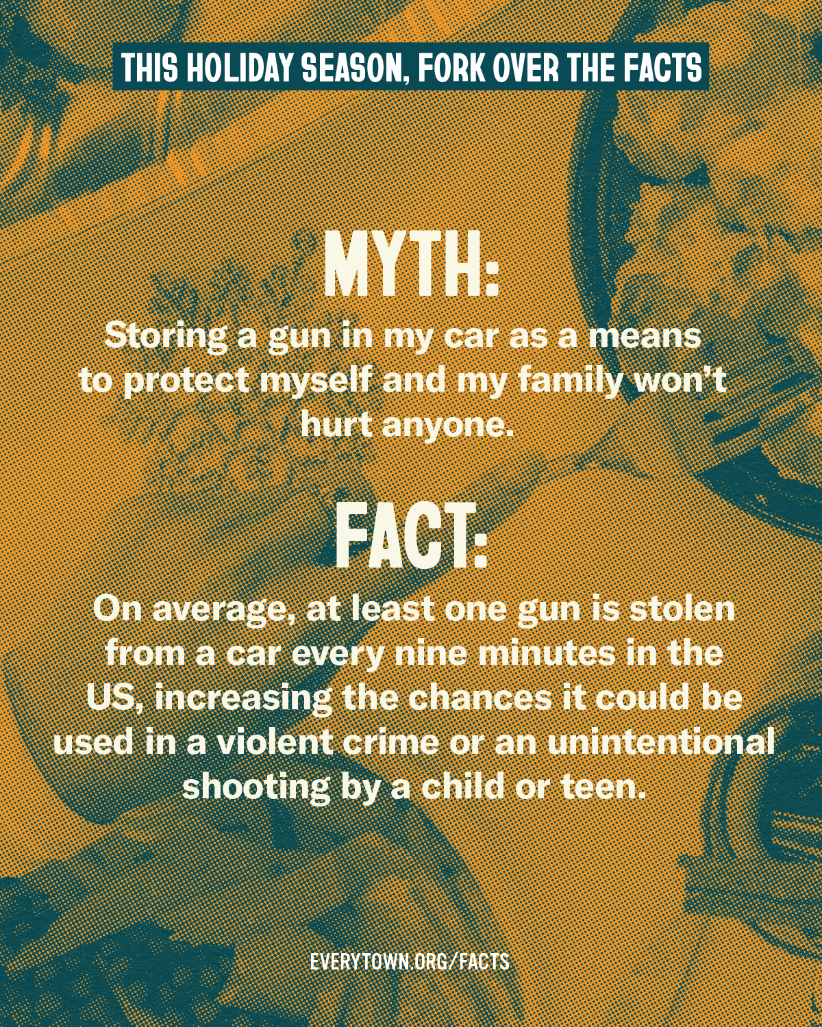 Every day, 125 Americans are killed with guns, and more than 200 are shot and wounded. There are a lot of widespread myths and conflicting information about guns, gun violence, and gun safety laws in America. To set the record straight, we’ve developed a series of graphics to help you “fork over the facts” and dispel some of the most prominent myths about gun violence.